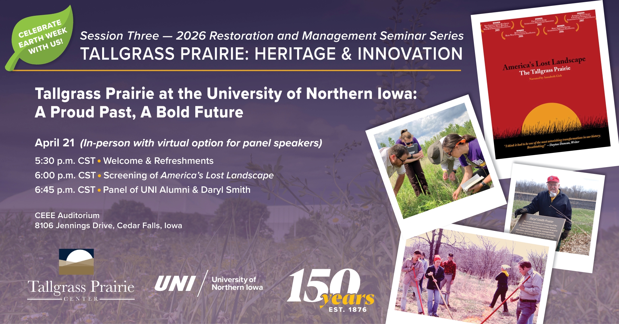 Join us this Earth Week to celebrate the legacy of tallgrass prairie at the University of Northern Iowa. This free seminar features a screening of the 2002 feature film "America's Lost Landscape: The Tallgrass Prairie" and a panel discussion featuring past and recent UNI alumni. Hear from UNI's "Prairie Panthers" as they continue to build the future of prairie restoration in Iowa and beyond.